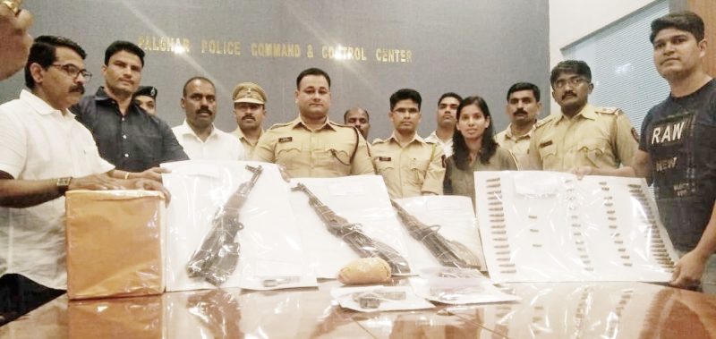 अधिकृत सुत्रांनी दिलेल्या माहितीनुसार, चिल्हार फाटा येथील उड्डाणपुलाच्या शेजारी असलेल्या हिंदुस्थान ढाबा परिसरात 29 सप्टेंबर रोजी काही इसम शस्त्रसाठा व अंमली पदार्थ विक्री करण्याकरीता येणार असल्याची खात्रीशीर माहिती सहाय्यक पोलीस निरिक्षक प्रताप दराडे यांना मिळाली होती. यानंतर दराडे यांनी तत्काळ वरिष्ठांना याबाबत अवगत केल्यानंतर मिळालेल्या माहितीनुसार 29 सप्टेंबर रोजी संध्याकाळी स्थानिक गुन्हे शाखा व मनोर पोलिसांनी सदर ठिकाणी सापळा रचला. यावेळी 6 वाजेच्या सुमारास काही संशयित इसम वजनदार गोणी घेऊन येथे आले. यानंतर पोलिसांनी त्यांच्यावर झडप घालत त्यांना ताब्यात घेऊन झडती घेतली असता सदर गोणींमध्ये 3 गावठी बनावटीच्या एके-47 सदृश रायफल, 4 गावठी बनावटीचे पिस्टल व रिव्हॉल्वर, 63 जिवंत काडतुसे असा शस्त्रसाठा तसेच 8 किलो 900 ग्रॅम इन्फ्रेडीन, 8 किलो 500 ग्रॅम डीएमटी, 500 ग्रॅम ब्राऊन शुगर, 3 किलो 900 ग्रॅम डोडो मा़िर्फन आदी अंमली पदार्थांचा साठा आढळून आला. ॅॅ