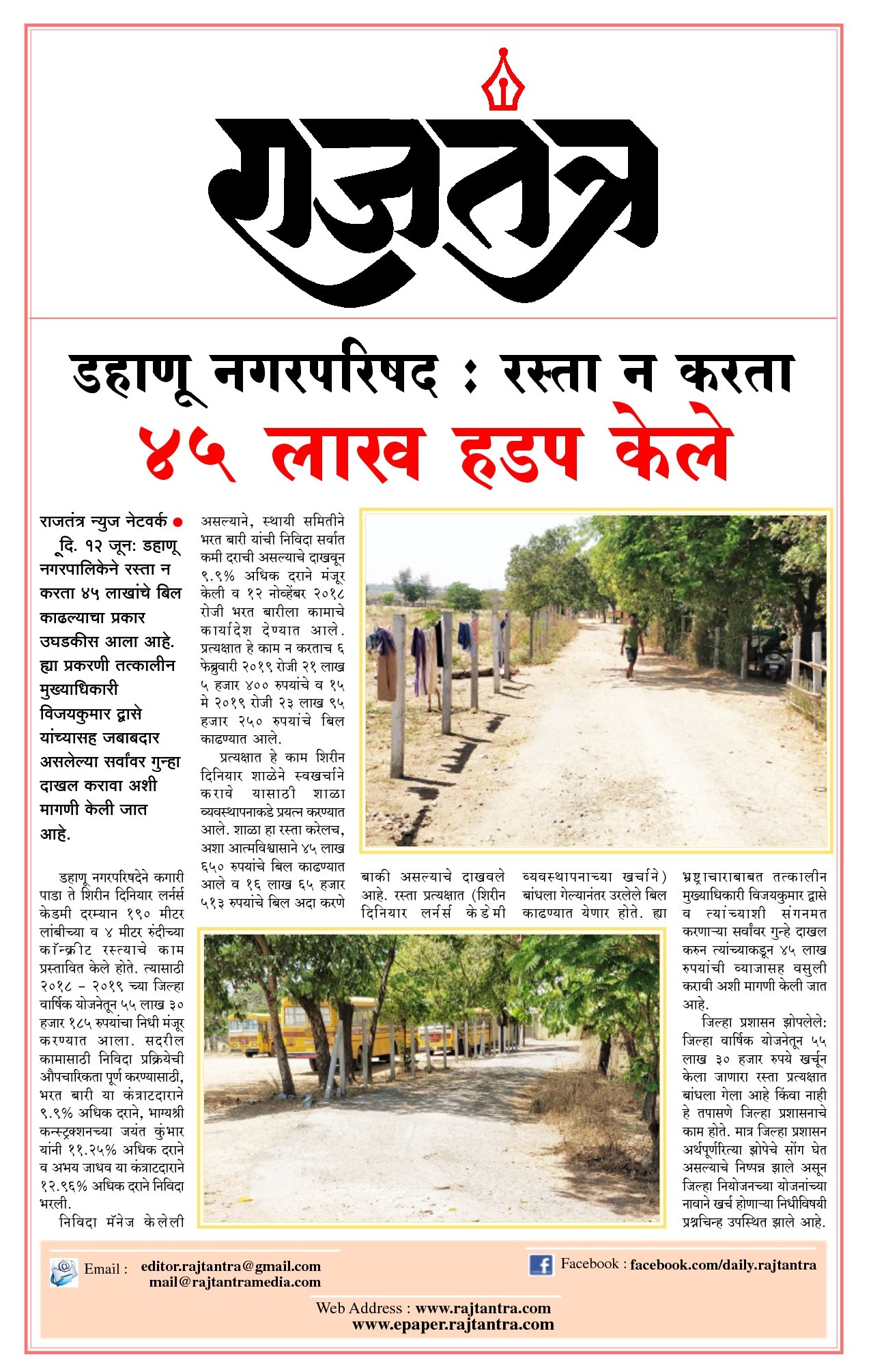 दि. 12 जून: डहाणू नगरपालिकेने रस्ता न करता 45 लाखांचे बिल काढल्याचा प्रकार उघडकीस आला आहे. ह्या प्रकरणी तत्कालीन मुख्याधिकारी विजयकुमार द्वासे यांच्यासह जबाबदार असलेल्या सर्वांवर गुन्हा दाखल करावा अशी मागणी केली जात आहे.