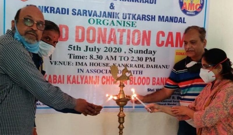 डहाणू दि. 6: ” डॉक्टर्स डे ” च्या औचित्याने, इंडियन मेडिकल असोसिएशनतर्फे श्रीमती डी. के. छेडा रक्तपेढी, डहाणू यांच्या सहकार्याने रक्तदान शिबिराचे आयोजन करण्यात आले. आय. एम. ए. हॉल (कंक्राडी) येथे रविवार, दि. ५ जुलै २०२० रोजी आयोजित करण्यात आलेल्या ह्या शिबिराचे उदघाटन डहाणू उप जिल्हा रुग्णालयाचे वैद्यकीय अधिक्षक डॉ. बालाजी हेंगणे व ज्येष्ठ वास्तुविशारद डॉ. नंदादीप कोकणे ह्यांच्या हस्ते झाले. शिबिरास नागरिकांचा उत्तम प्रतिसाद लाभला व एकूण 88 रक्तदात्यांनी रक्तदान केले. यावेळी डहाणूतील वैद्यकीय व्यावसायिक, कंक्राडी सार्वजनिक उत्कर्ष मंडळाचे अध्यक्ष भरत बारी, कंक्राडीचे पोलीस पाटील विघ्नेश बारी, इंडियन मेडिकल असोसिएशनच्या डहाणू शाखेचे अध्यक्ष डॉ. शागीर अत्तार, उपाध्यक्ष डॉ. पुनावाला, सचिव डॉ. ज्योती बापट, डी. के. छेडा रक्तपेढीचे चेअरमन विजय महाजन उपस्थित होते.
