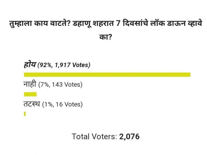 राजतंत्र कडे अनेक डॉक्टर्स, नगरसेवक, व्यापारी लॉक डाऊन व्हावे अशी भावना व्यक्त करीत आहेत. त्या पार्श्वभूमीवर आम्ही जनमताचा कौल घेतला असता 48 तासांत 2 हजार 76 लोकांनी आपली मते नोंदवली. ह्या जनमतामध्ये (अर्थात मते नोंदविणारे फक्त डहाणू शहरातील नाहीत) एक हजार 917 (92%) लोकांनी लॉक डाऊनच्या बाजूने कौल दिला असून फक्त 143 लोकांनी लॉक डाऊनच्या विरोधात कौल दिला आहे. 16 जण तटस्थ राहिले आहेत.