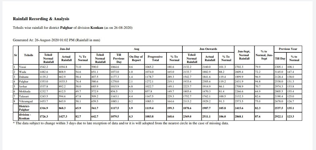 पालघर, दि. 26 ऑगस्ट: डहाणू तालुक्यात सरासरीच्या 96.9% इतका पाऊस पडला असून मोखाडा तालुक्यात मात्र सरासरीच्या अवघा 64.9% पाऊस पडला आहे. अन्य तालुक्यांची सरासरी पुढीलप्रमाणे: पालघर तालुका – 94.8%, तलासरी तालुका – 82.6%, वसई तालुका 79.9%, विक्रमगड तालुका 75%, वाडा तालुका 72.2, जव्हार तालुका 70.7%