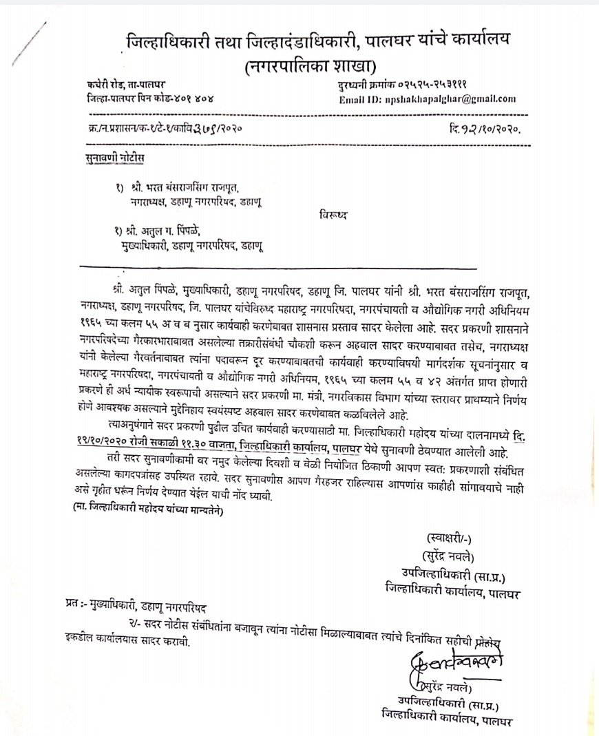 अतुल पिंपळे यांनी भरत राजपूत यांच्या विरोधात गैरप्रकार व गैरवर्तन केल्या प्रकरणी महाराष्ट्र नगरपरिषदा, नगरपंचायती व औद्योगिक नगरी अधिनियमाच्या कलम 55 अ व ब नुसार कारवाई करावी असा प्रस्ताव शासनास सादर केला होता. सदर अहवालाची व नगराध्यक्षांनी केलेल्या गैरवर्तनाबद्दल त्यांना पदावरून दूर करण्याबाबतची कारवाई करणेबाबत नगरविकास मंत्री यांना अर्धन्यायिक अधिकार असून त्यासाठी पालघरच्या जिल्हाधिकाऱ्यांकडून स्वयंस्पष्ट अहवाल मागविण्यात आला आहे. जिल्हाधिकारी आता 19 ऑक्टोबर रोजी दोन्ही पक्षकारांचे म्हणणे ऐकून घेतील व आपला अहवाल सादर करतील. याबाबतच्या नोटीसा आज उभय पक्षकारांना बजावण्यात आल्या आहेत.