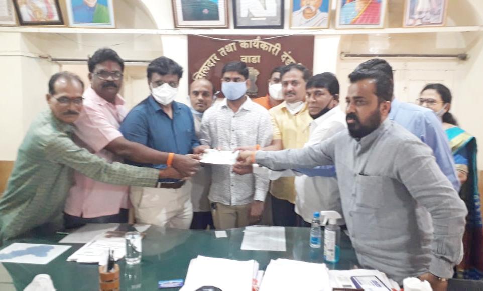 वाडा, दि. 11 : कोरोना महामारीच्या पार्श्वभूमीवर मुख्यमंत्री सहाय्यता निधीस आर्थिक सहाय्य करण्यासाठी मुख्यमंत्री उध्दव ठाकरे यांनी आवाहन केले होते. त्यास प्रतिसाद देत वाडा तालुका शिवसेनेच्या वतीने 1 लाख 12 हजार 931 रुपयांचा धनादेश शुक्रवारी (दि.11) वाडा तहसिलदार डॉ. उद्धव कदम यांच्याकडे सुपूर्द केला. तालुक्यातील शिवसेनेचे पदाधिकारी व कार्यकर्त्यांनी वैयक्तीकरित्या स्वत:कडील रक्कम जमा करुन हा मदत निधी उभारला आहे.