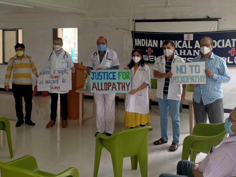 दि. 14 डिसेंबर: केंद्र सरकारच्या आयुष मंत्रालयाने आयुर्वेदीक डॉक्टरांना पदव्युत्तर शिक्षणक्रमात 58 प्रकारच्या ॲलोपॅथिक शस्त्रक्रिया करण्यास अनुमती दिल्याच्या कथित निर्णयाविरुद्ध इंडियन मेडिकल असोसिएशनने (आयएमए) दंड थोपटले असून 11 डिसेंबर रोजी भारत बंद आंदोलन करुन आपला विरोध प्रकट केला आहे. डहाणूच्या आयएमए शाखेने देखील अत्यावश्यक रुग्णसेवा वगळून बाह्य रुग्णसेवा बंद ठेवली होती. जनता बॅंक चौक येथे निदर्शने देखील करण्यात आली.