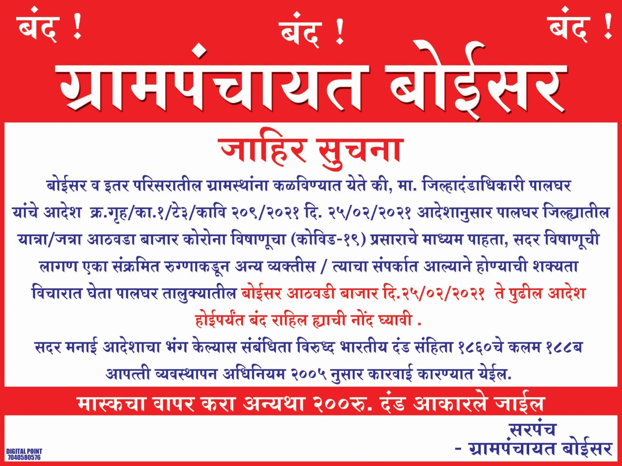 बोईसर, दि. 25 : पालघर जिल्ह्यात (ग्रामीण) वाढत असलेल्या करोना रुग्णांच्या पार्श्वभुमीवर पालघर जिल्हाधिकार्यांमार्फत जनसमुह जमा होत असलेल्या सार्वजनिक ठिकाणांवर निर्बंध लावण्यात आले आहेत. याचाच एक भाग म्हणून पालघर जिल्ह्यातील औद्योगिक क्षेत्र असलेल्या बोईसर येथे शुक्रवारी भरणारा आठवडा बाजार पुढील आदेशापर्यंत बंद ठेवण्याचा निर्णय घेण्यात आला आहे. बोईसर ग्रामपंचायतीमार्फत एका पत्रकाद्वारे ही माहिती देण्यात आली आहे. या मनाई आदेशाचा भंग केल्यास संबंधितांविरुद्ध भारतीय दंड विधान संहिता 1860 चे कलम 188 (ब) तसेच आपत्ती व्यवस्थापन अधिनियम 2005 नुसार कारवाई करण्यात येणार आहे. दरम्यान, बोईसर परिसरात विनामास्क वावरणार्या नागरीकांकडुन 200 रुपयांचा दंड आकरला जाणार असल्याचेही सदर पत्रकात म्हटले आहे.