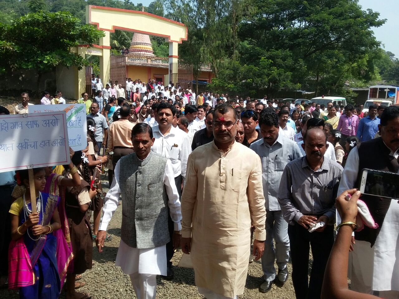 त्यानंतर मा. ना. श्री. सदाभाऊ खोत व मा.ना. श्री. विष्णु सवरा यांनी श्रमदाना करून शौचालयच्या शोषखड्डयांचे बांधकाम केले..
