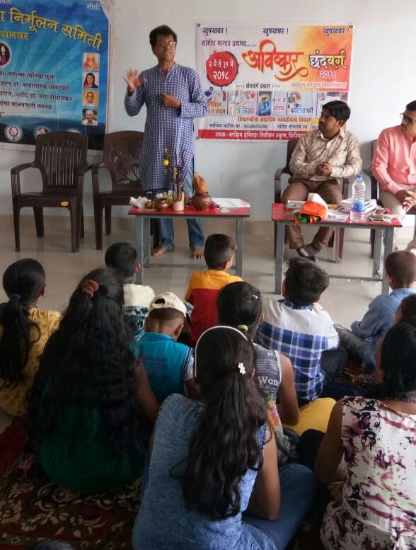 वाडा, दि. १३ : भूत-समंध-हाडळ, चमत्कार, जादू या मनोलकल्पीत गोष्टी असून यातून केवळ माणसांत भीती निर्माण होते. भितीतून केलेली कृती बुध्दीला गहाण ठेवते व जिथे बुध्दीला गहाण ठेवून कृती होते ती कृती केवळ अंधकृती असून ही अंधता माणसाला सर्वनाशाकडे घेऊन जाते. लाखो मैल दूर असणारे ग्रह माणसाच्या जीवनावर परिणाम करतात ही ज्योतीषांनी स्वताःच्या उदरनिर्वाहासाठी काढलेली भ्रामक कल्पना असून ज्योतिष म्हणजे केवळ स्वप्न विकण्याचा धंदा असल्याचे प्रतिपादन डाॅ. नरेंद्र दाभोलकर प्रणित अंधश्रध्दा निर्मूलन समितीचे पालघर जिल्हा शाखेचे सदस्य आण्णा कडलस्कर यांनी केले. ते शिरीषपाडा येथे अविष्कार छंदवर्ग आयोजित “चला डोळस बनूया” या उपक्रमा प्रसंगी बोलत होते.