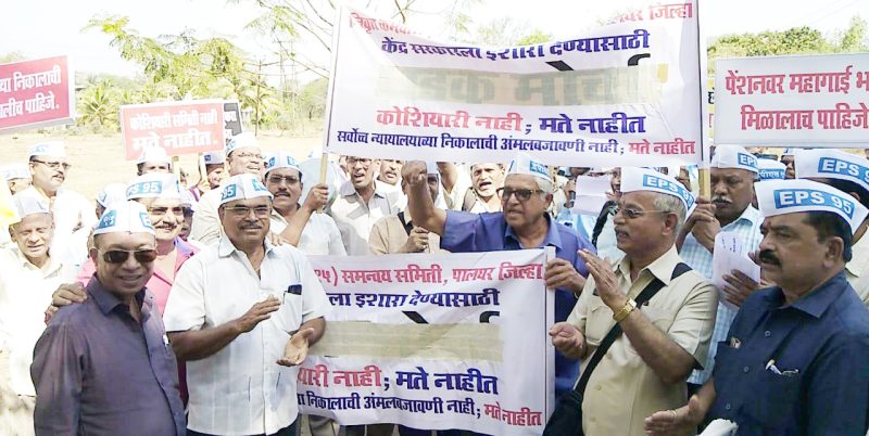 केंद्र व राज्य सरकारी कर्मचारी वगळता देशभरातील कामगारांसाठी केंद्र सरकारने 1995 साली पेन्शन योजना सुरु केली. या योजनेचा दर दोन वर्षांनी आढावा घ्यायचा असे तेव्हा ठरले होते. मात्र आढावा न घेतला गेल्याने गेल्या 21 वर्षात या योजनेद्वारे मिळणार्या पेन्शनमध्ये अद्याप वृध्दी झालेली नाही व निवृत्तांना किमान दोनशे ते कमाल दीड हजार रुपयांपर्यंत पेन्शन मिळत आहे. याबाबत भाजप प्रवक्ते व राज्यसभा सदस्यांच्या पाठपुराव्यामुळे 2012 साली तत्कालीन सरकारने भगतसिंग कोशियारी समितीची स्थापन केली. या समितीने किमान तीन हजार रुपये पेन्शन व त्यावर महागाई भत्त्याची शिफारस केली होती. मात्र तत्कालीन सरकारने सदर शिफारशी पूर्णतः न स्विकारल्याने आम्ही सत्तेवर येताच कोशियारी समितीच्या संपुर्ण अहवालाची अंमलबजावणी करण्याचे आश्वासन भाजपाच्या सर्वोच्च नेत्यांनी 2014 च्या निवडणूक प्रचारात दिले होते. मात्र सत्तेवर येऊन पाच वर्षे झाली, दरम्यानच्या काळात संघटनेने वारंवार आंदोलनाद्वारे सरकारचे याप्रश्नी लक्षही वेधले. मात्र तरीही सरकार केवळ आश्वासन देऊनच वेळ मारुन नेत असल्याने याचा विरोध म्हणून जिल्ह्यातील पेन्शनधारकांनी आज खासदार राजेंद्र गावीत यांच्या निवासस्थानाबाहेर थाळीनाद आंदोलन केले.