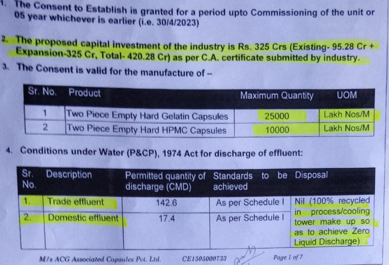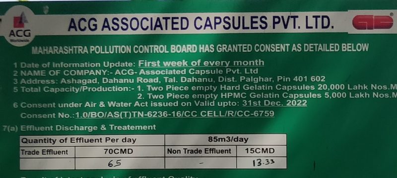 महाराष्ट्र प्रदूषण नियंत्रण मंडळाच्या कन्सेंट कमिटीने ३ डिसेंबर २०१५ च्या बैठकीमध्ये कंपनीने सांडपाण्यावर प्रक्रिया करुन त्याचा पुनर्वापर करण्याच्या व शून्य टक्के (0 Discharge) सांडपाणी सोडण्याच्या अटीवर एसीजी असोसिएटेड कॅप्सुल्स प्रा. लि. या कंपनीच्या प्रकल्प विस्तारासाठी डहाणू तालुका पर्यावरण संरक्षण प्राधिकरणाकडे शिफारस केली.