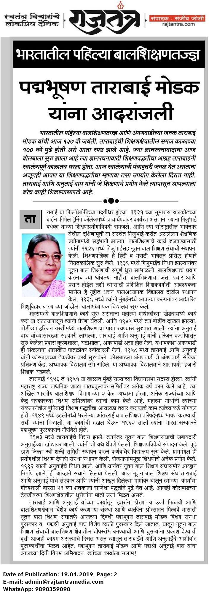 भारतातील पहिल्या बालशिक्षणतज्ज्ञ आणि अंगणवाडीच्या जनक ताराबाई मोडक यांची आज १२७ वी जयंती. ताराबाईंची शिक्षणक्षेत्रातील समज काळाच्या १०० वर्षे पुढे होती असे आता स्पष्ट झाले आहे. ज्या ज्ञानरचनावादाचा आज बोलबाला सुरु झाला आहे त्या ज्ञानरचनावादी शिक्षणपद्धतीचा आग्रह ताराबाईंनी स्वातंत्र्यपूर्व काळातच धरला होता. आज स्वातंत्र्याची पंचाहत्तरी जवळ येत असताना अजूनही आपण या शिक्षणपद्धतीचा म्हणावा तसा उपयोग केलेला दिसत नाही. ताराबाई आणि अनुताई वाघ यांनी जे शिक्षणाचे प्रयोग केले त्यापासून आपल्याला बरेच काही शिकण्यासारखे आहे. हा लेख JPEG Format मध्ये वाचण्यासाठी येथे CLICK करा